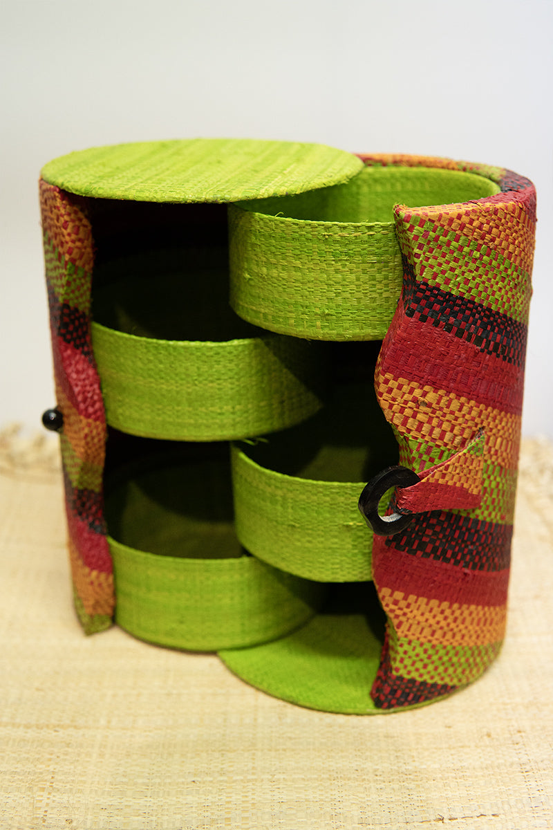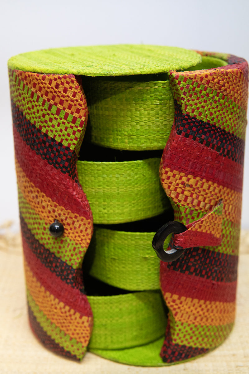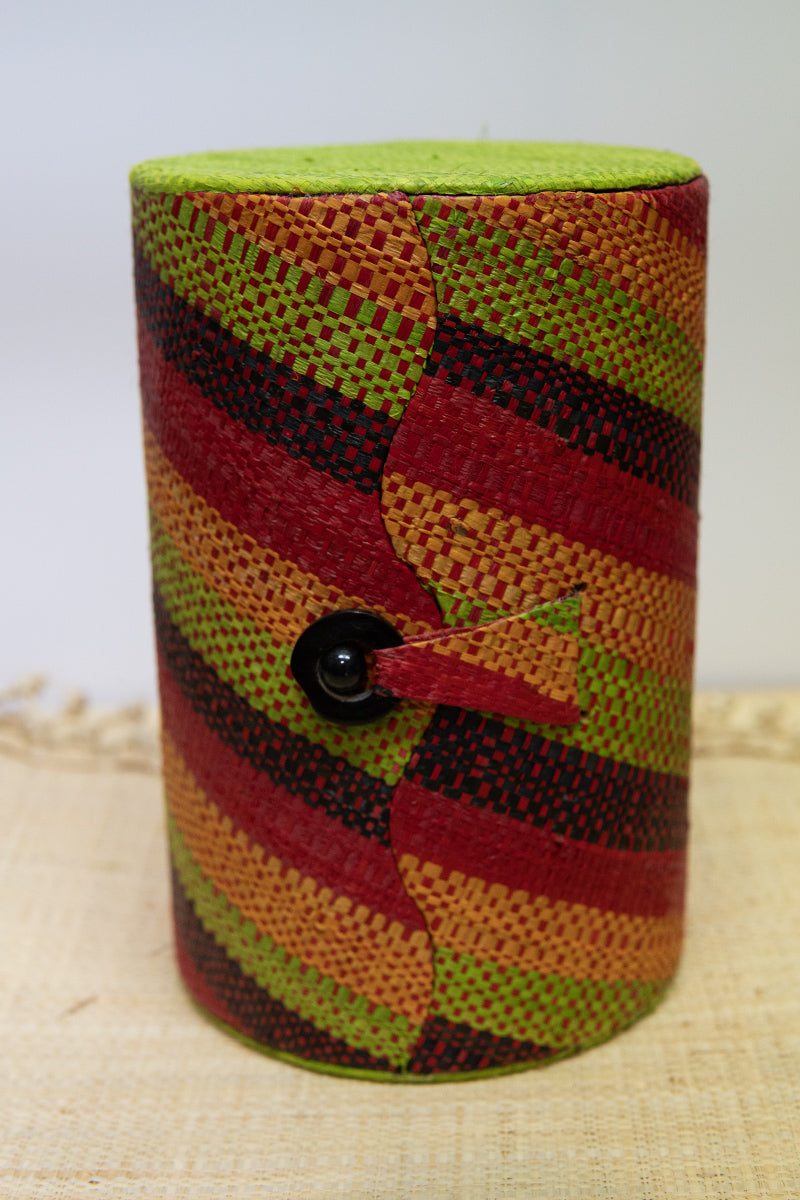 Allie esthétique et praticité avec cette boîte à bijoux en raphia, format moyen. Idéale pour ranger boucles d’oreilles, colliers et petits accessoires, elle est fabriquée à la main à Madagascar. Chaque modèle est unique, coloré, et apportera une touche chaleureuse et naturelle à ta déco.
