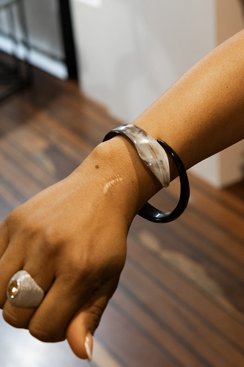 Bracelet fin en corne de zébu, façonné artisanalement à Madagascar. Son design en anneau serpent lui donne une silhouette fluide et élégante, facile à porter au quotidien. Chaque pièce est unique, avec des nuances naturelles allant du noir profond au caramel clair.