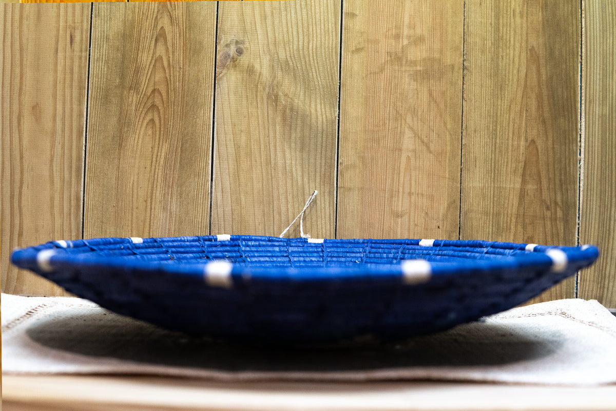 Tressée à la main en raphia naturel, cette corbeille joue sur un motif en spirale hypnotique mêlant des tons beige, bleu foncé et noir. Une pièce artisanale forte en caractère, parfaite comme centre de table, panier mural ou élément décoratif dans un intérieur moderne ou bohème.