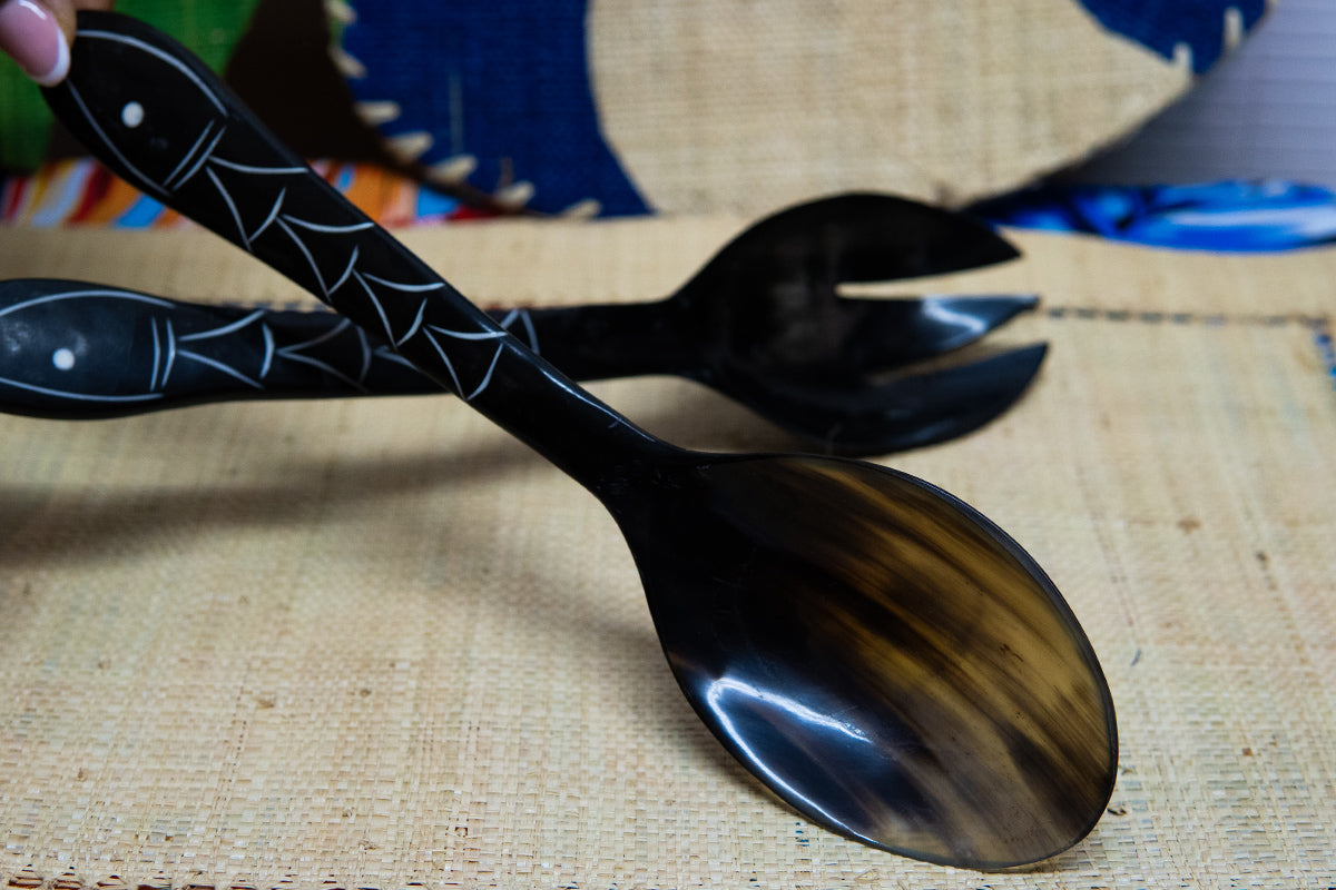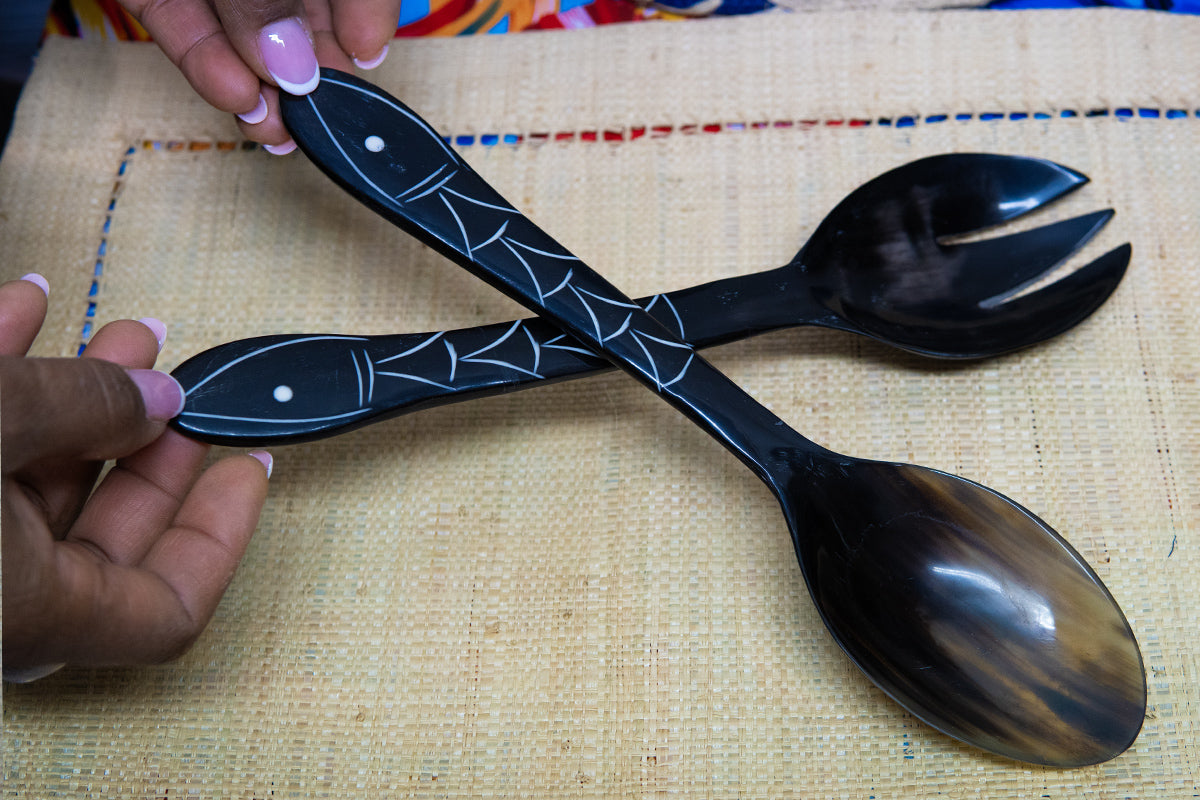 Cet élégant duo de couverts en corne de zébu est sculpté à la main à Madagascar. Idéal pour servir salades et plats familiaux, il allie design ethnique et matière naturelle. Les manches sont ornés de gravures traditionnelles, ajoutant une touche artisanale et culturelle à ta table.