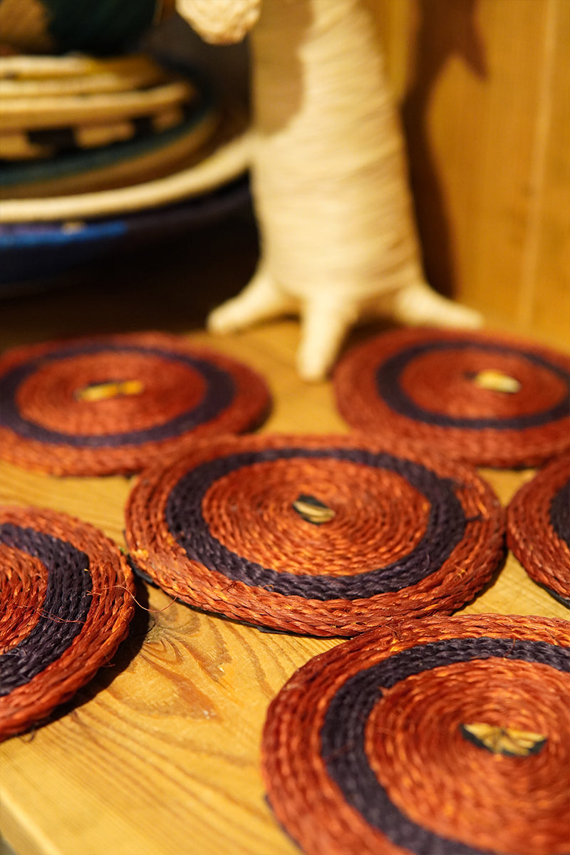 Élégant sous-verre en raphia de Madagascar, teinté orange et pourpre, travaillé en motif cercle. Idéal pour protéger vos surfaces tout en ajoutant une touche artisanale à vos repas.
